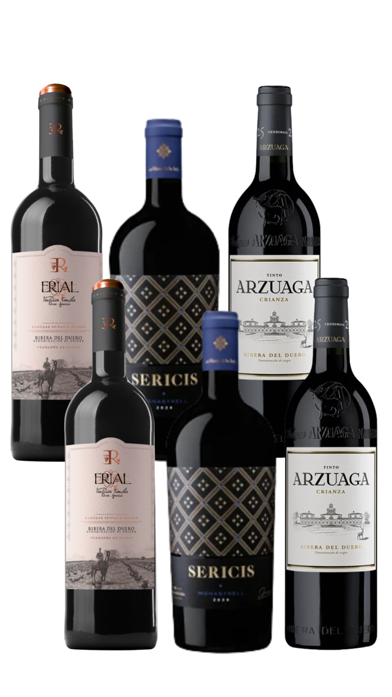 Este pack reúne 2 botellas de Sericis, 2 botellas de Arzuaga Crianza y 2 botellas de Erial TF en una selección pensada para quienes buscan tintos con ventas contrastadas, estilos complementarios y una compra fácil de disfrutar.