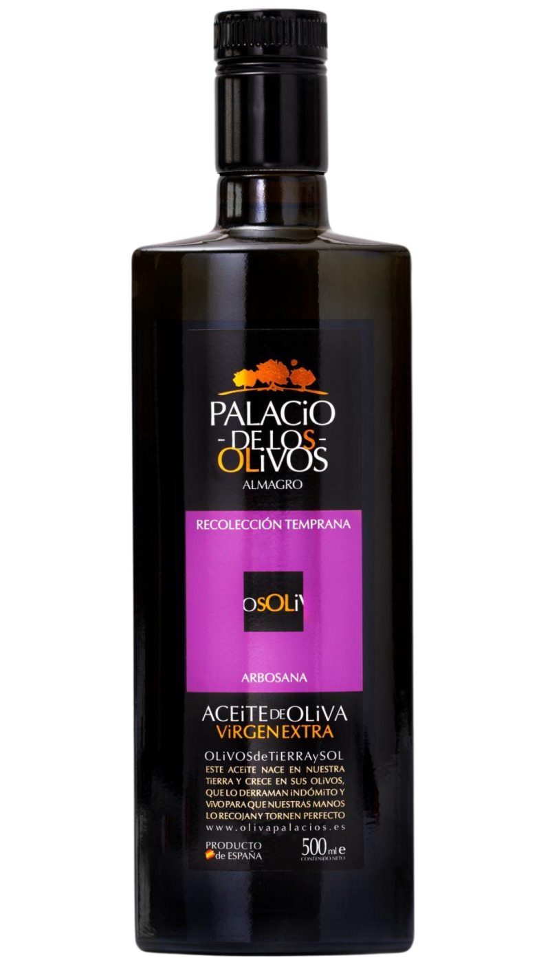 Aceite Virgen Extra Arbosana de Oliva Palacios es un AOVE monovarietal elaborado a partir de aceitunas seleccionadas cultivadas en Campo de Calatrava. Su producción cuida cada detalle para preservar la frescura y las गुणidades naturales del aceite, dando como resultado un perfil equilibrado, suave y muy versátil en cocina.